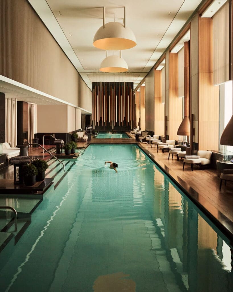Above Fifth Avenue, it’s quiet in a way that feels almost defiant. Thick walls. Meticulous soundproofing. A spa spanning three floors with hydrotherapy pools and treatments designed to lower stress. It’s a reset button in the middle of Manhattan.